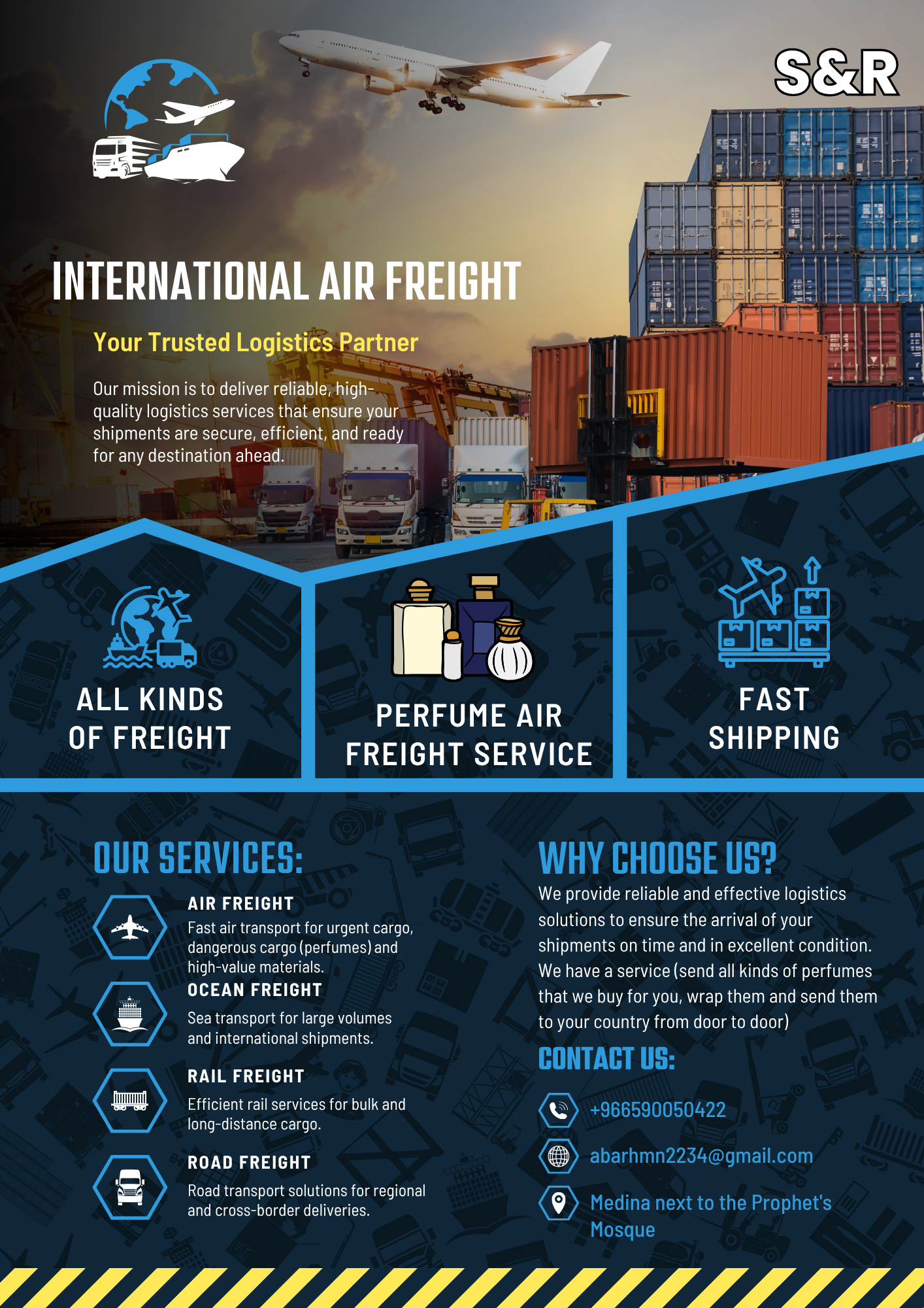 - S&R Express: شركة سعودية متخصصة في شحن العطور دوليًا، معتمدة من IATA، وتغطي أكثر من 100 وجهة عالمية بسرعة فائقة وجودة عالية.